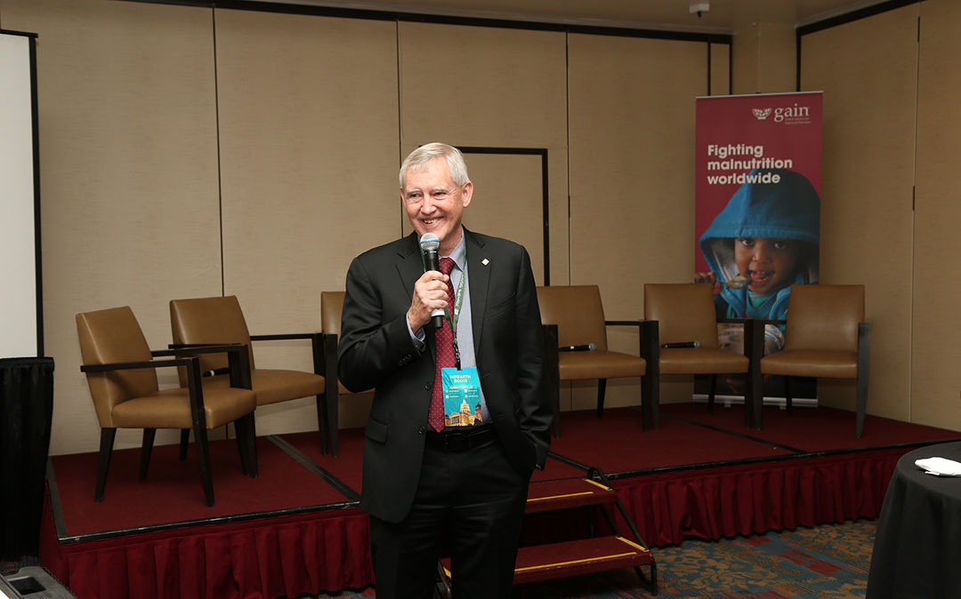Lawrence Haddad (right) and Howdy Bouis (middle) speak at the event celebrating the new GAIN-HarvestPlus partnership. © GAIN